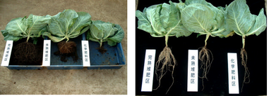 完熟堆肥区のキャベツが多くの土壌を抱え込んでいることが分かります